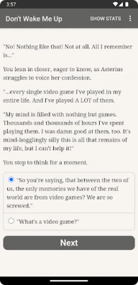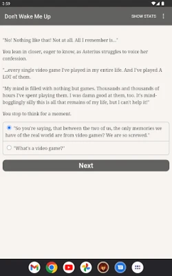 "Don’t Wake Me Up" is a 400,000-word interactive novel about love in video games, where your choices control the story. Entirely text-based, and driven by your imagination. It is written by Baudelaire Welch, a professional game screenwriter currently working as a companion character designer for RPGs.