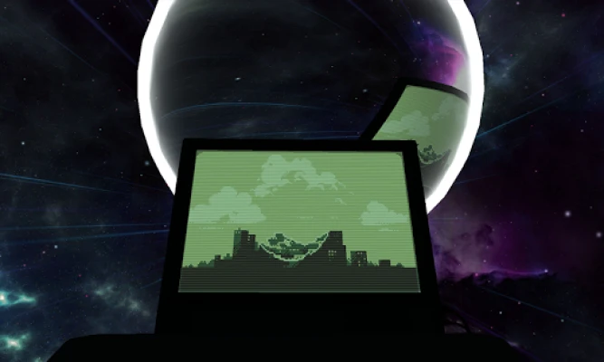 Covering for a colleague taking a bathroom break, you find yourself in front of a mysterious console with a green screen monitor showing a pixelated live image of an unknown city. Also present is an ominous red button with the simple instruction to not touch anything!